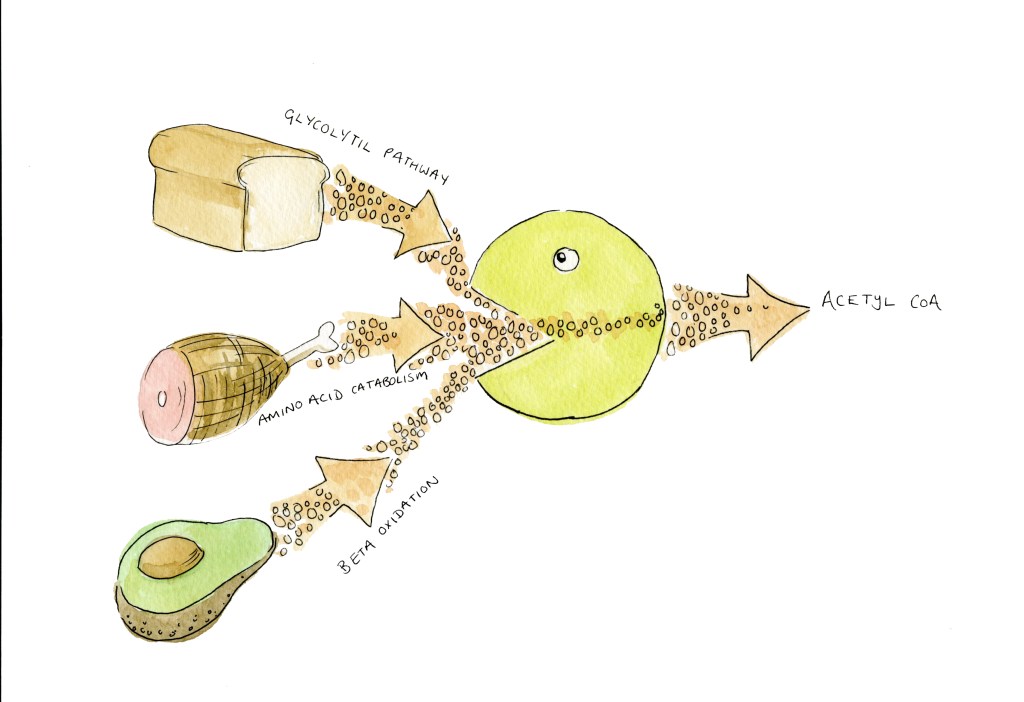 The glycolytic pathway is the breaking down of carbs or sugar. The amino acid catabolism is the breaking down of proteins. The beta oxidation is the breaking down of fat. Now, you will notice that these are the macronutrients that we find in food. So when we eat protein, carbs or fat, we make acetyl-CoA.