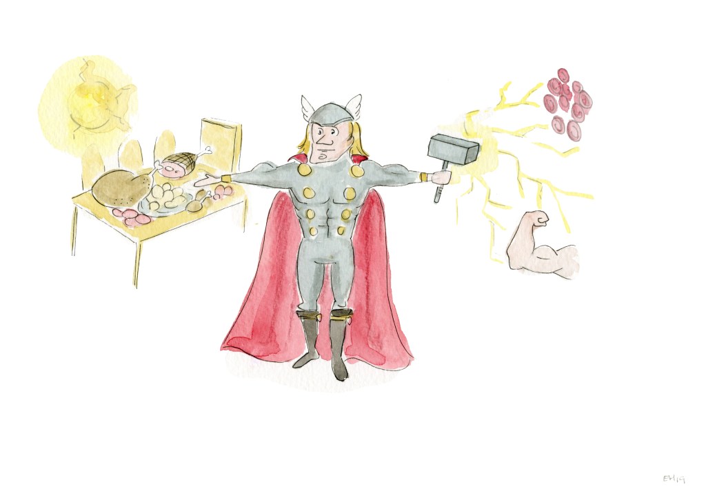Now, to help remember the mTOR pathway, I’d like to introduce another autophagy hero. This one is called Thor mTOR. Thor mTOR is all about growth, cell proliferation, protein synthesis and big muscles. If you give Thor MTOR some protein, he is happy and activated and will use his powers to ensure his environment is growing.
